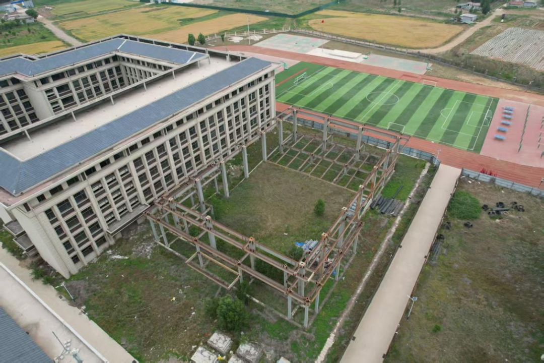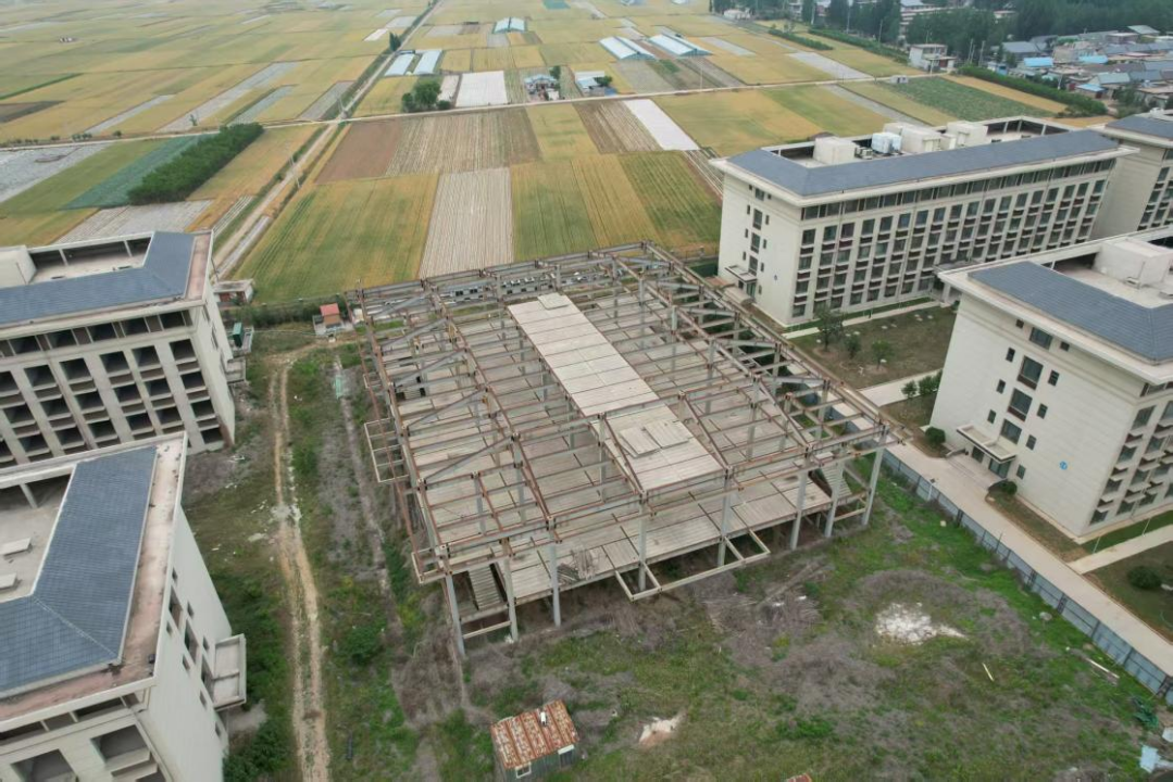 项目一期的教学工程只完成70%主体工程,裸露的钢筋上锈迹斑斑,墙体修建的安装工程停留在一半,风穿过未封闭的窗口发出呜咽声。餐厅、宿舍楼等工程,仍然只搭起了钢架,裸露在风中。烂尾项目的旁边就是尚未占用的良田,对比之下,可谓愕然叹惋。